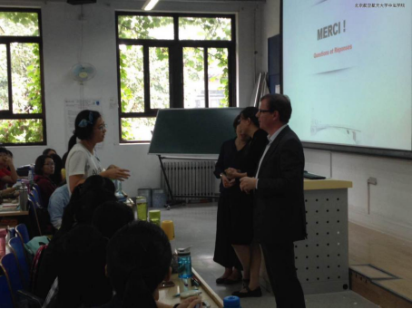 经过两位院长的讲解,同学们已经大体上了解了本次项目的情况。在接下来的交流互动过程中,2015级的同学们分别针对本次游学交流的内容安排、名额选拔提出了一些问题,两位院长也分别用中文及法语耐心地解答了同学们的疑问,让同学们对游学活动的细节也有了更深的认识和了解,同时鼓励2015级经济困难的学生也积极地参与到本次交流活动中,学院会针对特定学生的情况给予最大程度的帮助。