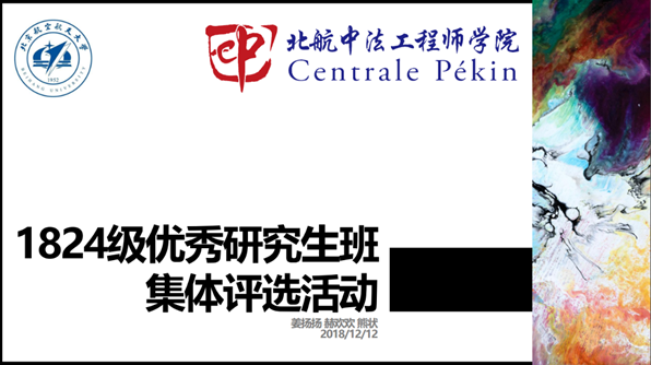 所在的第一分组答辩会准时在新主楼A849开始。本次答辩准备材料包括:班级工作经验及先进事迹的整理文稿,班级在北航新闻网和学院网站等媒体上关于班集体建设方面新闻稿的发表情况,以及答辩的PPT。答辩由熊状、姜扬扬、赫欢欢三位同学代表18241班集体进行。他们从班级基本情况、班级党团建设、班级活动以及总结展望这四个方面,条理清晰地展示了18241班级的国际化、企业化特色,和团结、奋进、自强的良好班级氛围。